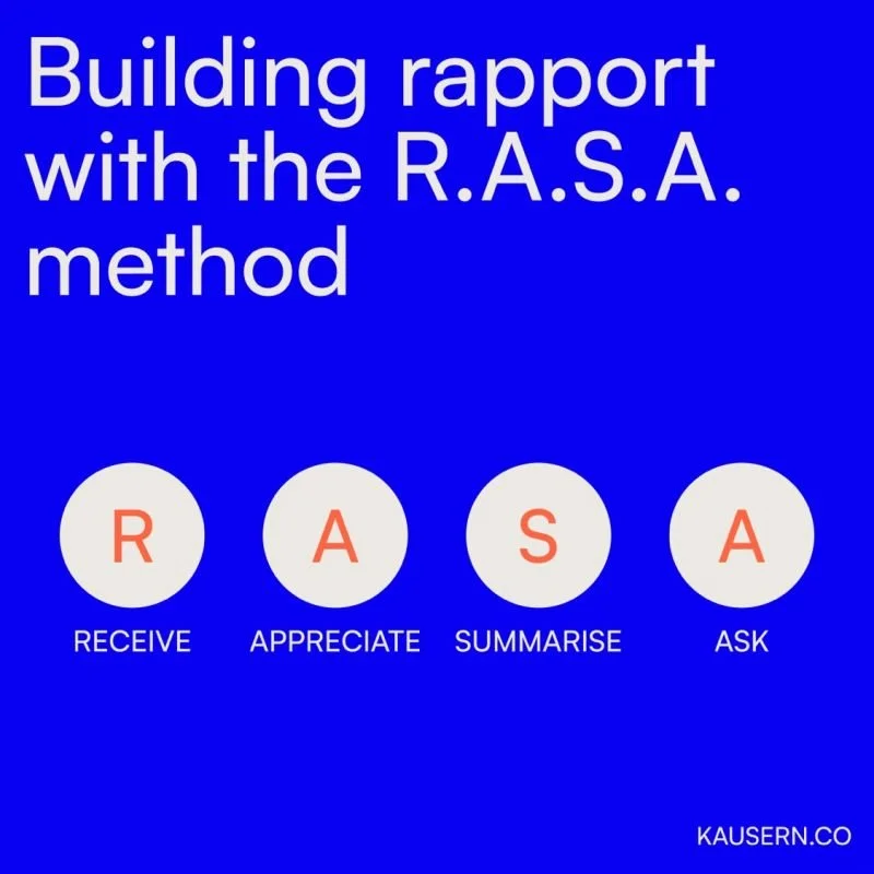Although R.A.S.A. is used to improve our general listening skills,this structured approach can also be applied to building rapport. (I also like this acronym because it means “feel” in Bahasa Melayu, which is most appropriate in this context of relationship building.)