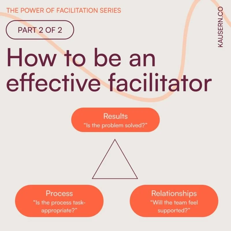 Facilitation is collaboration, and the success in collaborative efforts is a multi-dimensional affair not solely defined by results. When a leader puts on their facilitation hat, they should do so with the mindset of balancing these three dimensions (see image):